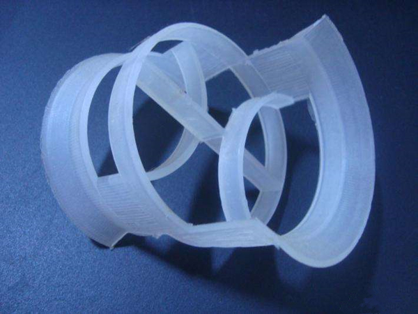 共軛環(huán)結(jié)合了環(huán)形和鞍形填料的優(yōu)點(diǎn),采用共軛曲線肋片結(jié)構(gòu),兩端外卷邊及合適的長(zhǎng)徑比,填料間或填料與塔壁間均為點(diǎn)接觸,不會(huì)產(chǎn)生疊套。孔隙均勻,阻力小,亂堆時(shí)取定向排列